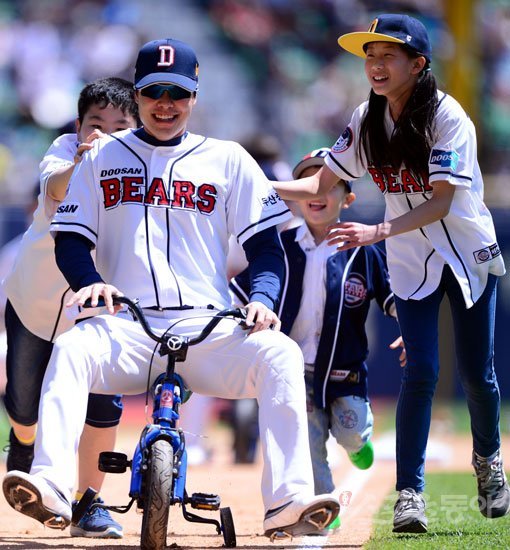 프로야구 선수도 동심의 세계로! 두산 민병헌이 5일 잠실구장에서 열린 LG전에 앞서 열린 어린이날 행사에서 어린이 야구팬들과 함께 자전거 달리기에 참가해 역주하고 있다. 해맑은 어린이들과 민병헌의 표정이 싱그럽다. 잠실|김진환 기자 kwangshin00@donga.com