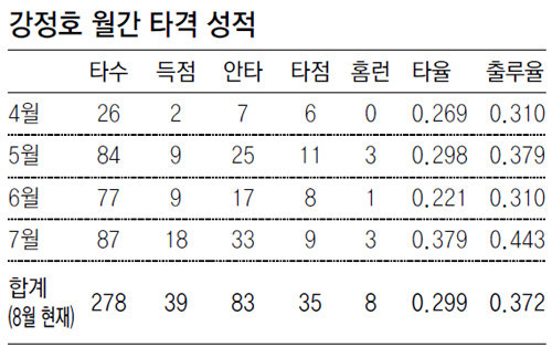 하지만 강정호는 7월 한 달 동안 타율 0.379에 출루율 0.443으로 내셔널리그 신인 가운데 가장 뛰어난 기록을 보여줬다. 득점, 안타, 타점 등에서 돋보였다. 올스타전 휴식기가 포함돼 있는 7월에 18득점, 33안타, 9타점, 3홈런으로 팀 승리에 앞장섰다. 강정호는 4월 타율 0.269로 평범한 성적을 보였다. 시범경기 때는 투수들의 구위 적응에 애를 먹으며 연속 삼진의 수모를 당했다. 하지만 경기 출장수가 많아진 5월에 들어서면서 KBO 리그에서 보여줬던 자신의 스윙을 되찾았다. 세인트루이스의 마무리 트레버 로즌솔로부터 생애 첫 홈런을 뽑은 것도 5월이었다.