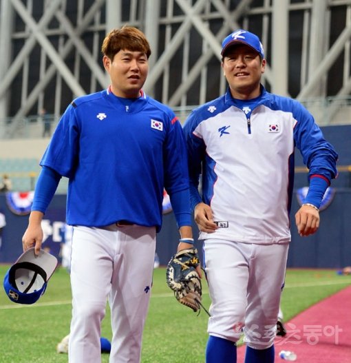 대표팀 안방은 그간 베테랑 포수와 강민호(롯데)의 2인 체제로 구성돼왔다. 강민호는 다양한 국제경험을 쌓았고, KBO리그에서 좋은 활약을 펼친 양의지(두산)가 합류하면서 선의의 경쟁구도가 형성됐다. 양의지(왼쪽)와 강민호가 4일 고척스카이돔에서 훈련하던 도중 밝은 표정으로 대화를 나누며 걸어가고 있다. 고척|김진환 기자 kwangshin00@donga.com