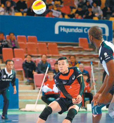 ‘월드 리베로’ 여오현이 상대의 공을 받아내려 하고 있다. 여오현은 상대 공격의 흐름을 읽고 정확히 공을 받아 동료들에게 연결한다. 현대캐피탈 제공