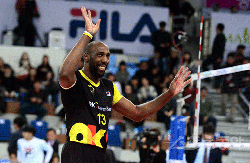 31일 인천 계양체육관에서 ‘2015-2016 NH농협 V리그’ 인천 대한항공과 안산 OK저축은행의 경기가 열렸다. OK저축은행이 대한항공에 3-0으로 승리한 뒤 맹활약을 펼친 시몬이 팬들을 향해 환한 미소를 짓고 있다. 인천|김민성 기자 marineboy@donga.com