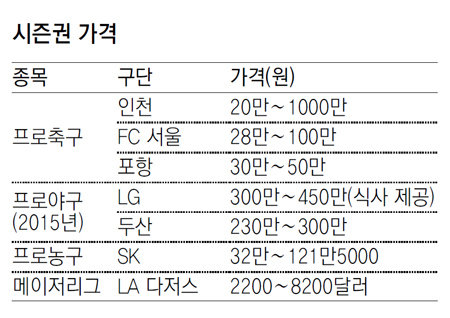 1000만 원짜리 시즌권은 종목을 불문하고 세계적으로도 보기 힘든 가격이다. 류현진이 활약하는 메이저리그 LA 다저스의 시즌권 가격은 2200달러(약 265만 원)∼8200달러(약 987만 원)이다. 잠실구장을 안방으로 쓰는 프로야구 LG의 시즌권(2015년)은 300만∼450만 원이다. LG는 안방에서 72경기를 치른다. 인천의 올해 안방경기는 20경기다.