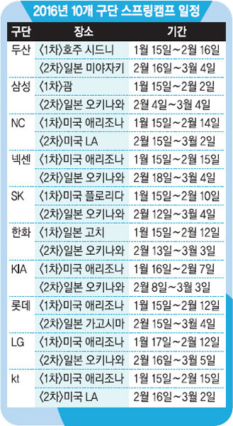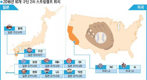 롯데와 두산은 15일과 16일 일본 열도 규슈 남쪽의 가고시마와 미야자키로 각각 향한다. 스프링캠프를 미국에 ‘올인’한 팀들도 있다. 미국 LA에선 NC와 kt의 2차 캠프가 열린다. 창단 이후 줄곧 1·2차 캠프를 미국에 차려온 NC에 제10구단 kt가 가세해 1차 전훈지인 애리조나 투산에 이어 LA에서도 사이좋게 훈련을 이어간다.