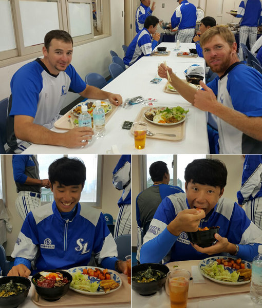 사자들의 설 만찬 프로야구선수들은 대부분 매년 스프링캠프에서 설을 맞이한다. 오키나와에 2차 캠프를 차린 삼성의 새 외국인선수 앨런 웹스터(위쪽)와 콜린 벨레스터가 명절 음식을 먹으며 만족스러워하고 있다. 신인 최충연은 떡국과 전, 비빔밥 등 한가득 차려 먹고 있다(아래 왼쪽부터). 사진제공|삼성 라이온즈