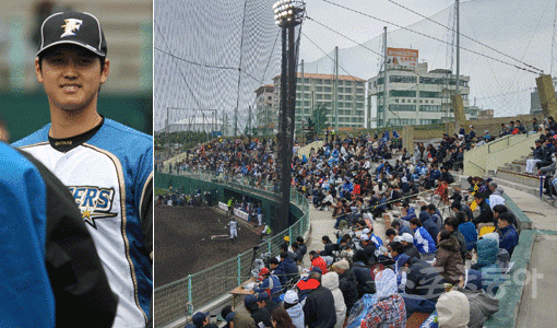 24일, 오키나와 서쪽 해안과 맞닿아 있는 나고시영구장은 평일임에도 일본 야구팬들로 인산인해를 이뤘다. 니혼햄은 미국 애리조나에서 1차 전지훈련을 마치고, 오키나와 나고에 2차 캠프를 차렸다. 니혼햄의 최고 스타는 단연 오타니다. 국가대표팀 에이스로 평소에도 팬들을 구름처럼 몰고 다니는데 이날 KIA전은 선발등판까지 예고돼 있었다. 오키나와 캠프 첫 실전등판이었다.