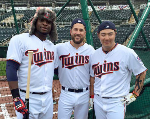 박병호, 동료들과 함께 미네소타 박병호가 타격훈련을 마친 뒤 3루수 트레버 플루프(가운데), 지난 시즌 4번 타자로 활약한 거포 1루수 미겔 사노(왼쪽)와 함께 기념사진을 찍고 있다. 트레버 플루프 인스타그램