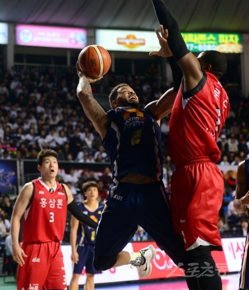 9일 전주실내체육관에서 열린 ‘2015-2016 KCC 프로농구’ 4강 플레이오프 2차전 전주KCC와 안양KGC 경기에서 KCC 에밋이 KGC인삼공사의 수비를 뚫고 골밑을 공격하고 있다. 전주|김종원기자 won@donga.com