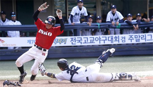 주자 홈플레이트 못밟고 포수는 주자 태그 못하고… 8일 서울 목동구장에서 열린 황금사자기 전국고교야구대회 겸 주말리그 왕중왕전 인천고와 유신고의 경기 9회초 2사 1, 2루에서 홈으로 뛰어드는 인천고 2루 주자 이정우(3학년·왼쪽)를 유신고 포수 유승오(3학년)가 태그하려 하고 있다. 구심은 주자는 홈플레이트를 터치하지 못했고 포수는 주자를 태그하지 못했다고 판단해 곧바로 판정을 내리지 않았다. 상황을 파악한 이정우가 홈플레이트를 터치하려 했지만 유승오가 먼저 이정우의 몸을 태그해 그대로 경기가 끝났다. 홍진환 기자 jean@donga.com