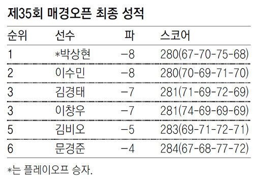 1차 연장전에서 이수민과 똑같이 파로 맞선 박상현은 18번홀(파4)에서 열린 2차 연장전에서 17m 버디 퍼팅은 놓쳤지만 30cm도 안되는 ‘OK’ 파 퍼팅을 넣어 4m 파 퍼팅을 실패한 이수민을 꺾었다.