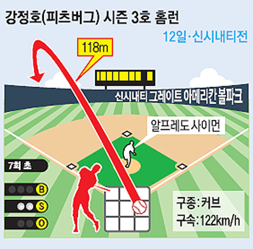 이날 강정호는 팀이 2-4로 뒤진 7회초 알프레도 사이먼의 3구째 시속 122km 커브가 한가운데 몰리자 놓치지 않고 받아쳐 좌월 솔로홈런으로 만들었다. 추격의 발판을 마련한 값진 아치였다. 강정호에게 일격을 당한 사이먼은 곧바로 교체됐다.