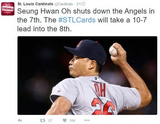 오승환은 12일(현지시간) 미국 캘리포니아 주 애너하임 에인절 스타디움에서 열린 로스앤젤레스 에인절스와의 인터리그 방문 경기에서 팀이 10-7로 앞선 6회 말 선발 투수 애덤 웨인라이트로부터 바통을 이어받아 마운드에 올랐다.
