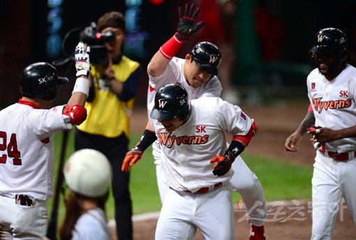 SK 최승준은 거포 유망주로 평가받았으나 잠재력을 터트리지 못하고 지난 시즌이 끝난 뒤 LG에서 SK로 이적했다. 그런 그가 18일 롯데와 홈경기에서 7회말 대타로 나서 만루홈런을 터트리며 활짝 웃었다. 홈런을 친 뒤 동료들의 환영을 받고 있는 최승준(가운데). 문학|김민성 기자 marineboy@donga.com