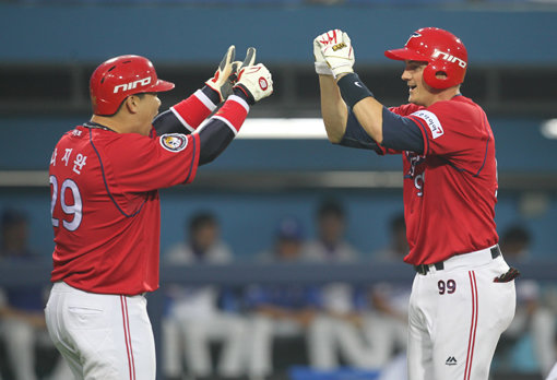 나지완(왼쪽)은 스스로 “미운오리새끼에서 더 멀리 나는 나비가 되겠다”고 했다. 자신의 약속처럼 26일 대구삼성라이온즈파크 삼성전에서 시즌 8호 홈런을 쳤다. 3회 1타점 적시타를 친 후 다음타자 필(오른쪽)의 2점 홈런 때 축하의 세리머니를 하고 있다. 사진제공|스포츠코리아