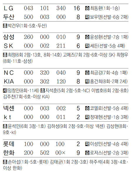 한편 잠실에서는 LG가 서울 라이벌 두산을 상대로 화끈한 설욕전을 벌이며 4연패를 끊었다. LG는 홈런 없이 안타만 20개를 치며 16-8로 두산을 대파했다. LG는 1회말 두산에 먼저 5점을 내줬지만 2회초부터 곧바로 추격의 불씨를 지폈다. 외국인 타자 히메네즈의 2루타를 포함해 다섯 타자가 연속 안타를 치며 단번에 4점을 따라붙었다. 3회초에도 2사 이후에만 3득점을 하며 경기를 뒤집었다. 두산의 선발 투수 보우덴은 올 시즌 프로야구 데뷔 후 처음으로 5이닝을 채우지 못한 채 2와 3분의 2이닝 만에 마운드에서 내려갔다.