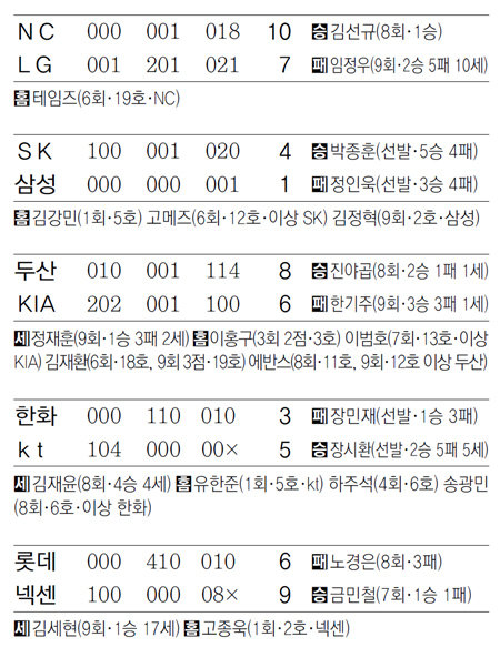 NC도 9회에만 8점을 뽑으며 창단 이래 팀 최다인 11연승을 달렸다. 8회까지 6-2로 앞서던 LG는 9회에 이동현이 아웃카운트를 잡지 못하고 두 타자를 안타와 볼넷으로 내보낸 뒤 마무리 임정우마저 3연속 안타와 볼넷을 내주며 무너졌다. NC는 이어진 만루 찬스를 살리며 8점을 뽑는 집중력을 발휘했다. 이날 테임즈도 잠실구장에서 첫 홈런포를 쏘아 올려 김재환과 함께 홈런 공동 1위(19개)에 올랐다.