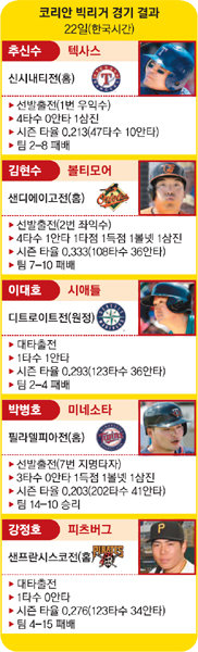 시애틀 이대호(34)는 코메리카파크에서 열린 디트로이트와 원정경기에 9회초 대타로 나서 안타를 기록했다. 이대호의 타율은 0.293(123타수 36안타)이 됐다. 피츠버그 강정호(29)는 PNC파크에서 열린 샌프란시스코와 홈경기에 대타로 출장해 2루수 땅볼로 물러났다. 타율은 0.276(123타수 34안타).