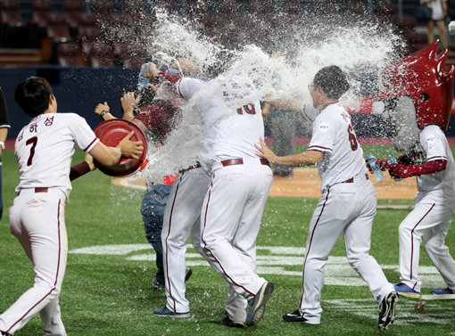 넥센 신재영이 22일 고척 삼성전에서 7이닝 무실점으로 시즌 10승에 도달했다. 팀 동료들이 승리 직후 신재영에게 물세례를 퍼부으며 격한 축하를 보내고 있다. 사진제공|스포츠코리아
