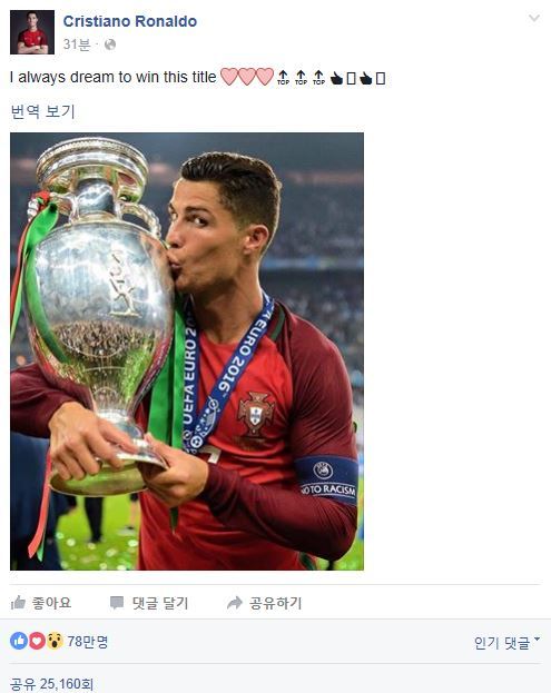 크리스티아누 호날두(31·레알 마드리드)가 자신의 공식 소셜미디어를 통해 ‘유로2016’ 우승 소감을 전했다.