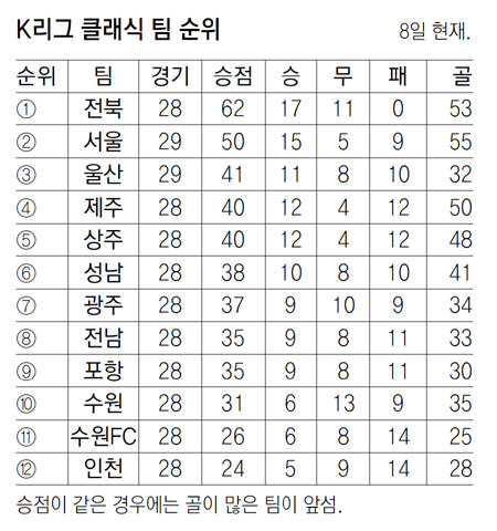 K리그 클래식 12개 팀은 8일 현재 팀별로 28, 29경기씩 치렀다. 스플릿 라운드 돌입 전까지 팀당 4, 5경기만 남았다. 하지만 아직까지 상하위 리그의 윤곽을 알 수가 없다. 3위와 9위의 승점 차가 6점밖에 나지 않을 정도로 순위 경쟁이 치열하다. 1위 전북(승점 62)과 2위 서울(승점 50)을 빼고는 어느 팀도 상위 리그행을 자신하기 힘들다. 상위 리그행 마지노선인 6위 성남(승점 38)과 9위 포항(승점 35)의 승점 차는 3점밖에 되지 않는다. 맞대결 승리 한 번이면 따라잡을 수 있는 차이다. 3위 울산(승점 41)은 4∼9위 팀들보다 한 경기를 더 치렀기 때문에 승점에 여유가 없다.
