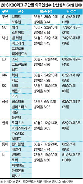 외국인투수 농사에 따라 성적이 좌우되는 현상은 올 시즌에도 계속되고 있다. 실제로 외국인투수 교체 없이 시즌을 치른 4개팀 중 롯데를 제외한 3개팀(두산·NC·KIA)이 ‘A클래스(1~5위)’에 자리 잡고 있다. 니퍼트(21승)와 보우덴(18승)이 무려 39승(10패), 방어율 3.44를 합작한 두산은 정규시즌 우승을 차지했다. 보우덴은 28일 대전 한화전에서 18승째(7패)를 따내며 두산의 KBO리그 단일시즌 최다 선발승(75승) 기록을 만든 주인공이 됐다.