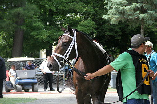 미국 사라토가 경마장에서 경주를 앞두고 예시장에서 현지 경마팬들에게 모습을 보인 한국 마사회 소속 2세마 ‘J. S. Choice’. 마사회가 수년간 공들여 추진한 케이닉스 사업의 핵심 성과로 꼽히는 ‘J. S. Choice’는 11월 꿈의 무대로 불리는 브리더스컵 출전을 앞두고 있다. 사진제공|한국마사회