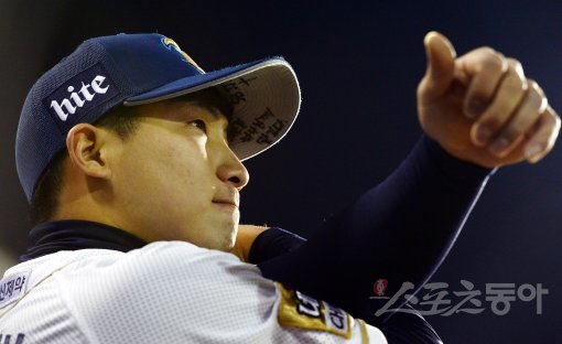 2일 창원 마산야구장에서 ‘2016 타이어뱅크 KBO리그’ 두산 베어스와 NC 다이노스의 한국시리즈 4차전 경기가 열렸다. 나성범의 모자에 ‘모든걸 하나님께 맡긴다’라는 문구가 적혀 있다. 마산 | 김민성 기자 marineboy@donga.com