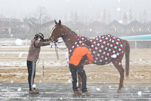 렛츠런파크 서울 경주로에도 함박눈이 쏟아진 가운데 경주마들이 눈보라를 가르며 설원을 질주하는 진풍경이 펼쳐졌다. 겨울이 오면 경마관계자들의 손과 발은 더 바빠진다. 뚝 떨어진 기온에 말들이 혹시 감기에 걸리지 않을까 걱정하며 많은 준비를 한다. 말도 사람처럼 감기에 걸리고 주위의 말들에 전염을 시킨다. 억대 몸값을 자랑하는 경주마들의 VIP급 겨울나기가 궁금하다.