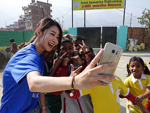 봉사활동에 참가한 ‘렛츠런엔젤스’가 네팔 어린이들과 셀카를 찍으며 즐거워하고 있다. 사진제공 ㅣ 한국마사회