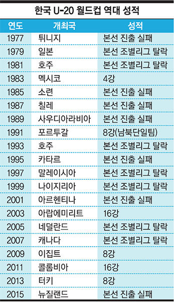한국은 이후 본선 진출 실패와 조별리그 탈락만을 되풀이하다 2003년 아랍에미리트(UAE)대회에서 조별리그를 통과해 16강에 진출했다. 당시 U-20 대표팀 주축 멤버는 지난해 K리그 클래식(1부리그) 득점왕 정조국(전 광주FC·현 강원FC)과 FC서울 우승의 일등공신 박주영 등이다.