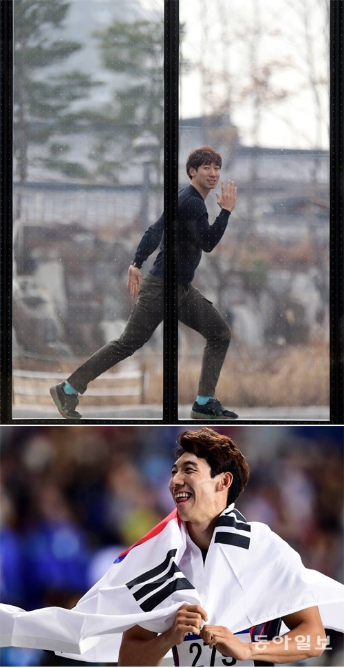 2017년 여호수아는 20년 경력의 육상 선수에서 봅슬레이 선수로 새로운 도전을 시작한다. 육상 선수 시절부터 계주에서도 첫 번째 주자를 도맡을 정도로 스타트에 자신을 보였던 그는 스타트 기록이 중요한 봅슬레이에도 빠르게 적응할 것으로 기대된다. 인천 송도 센트럴파크에서 힘차게 포즈를 취한 여호수아. 두번째 사진은 2014년 인천 아시아경기 육상 남자 200m에서 동메달을 따고 환호하는 여호수아. 인천=홍진환 기자 jean@donga.com