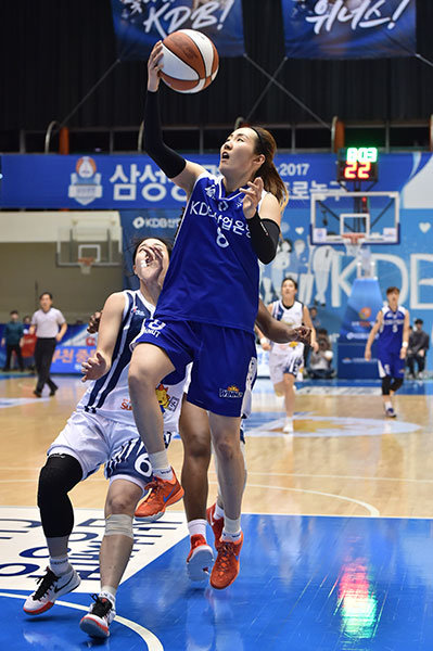 KDB생명 노현지(오른쪽)가 4일 구리체육관에서 열린 신한은행과의 홈경기 도중 속공 득점을 올리고 있다. 사진제공 | WKBL