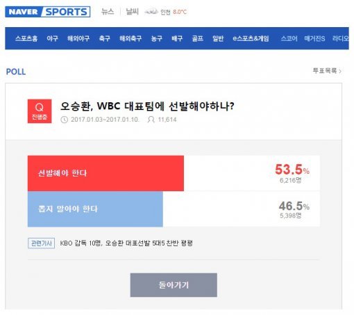국내 최대 포털사이트 네이버는 3일부터 홈페이지를 통해 ‘오승환, WBC 대표팀에 선발해야 하나?’라는 주제로 팬 투표를 진행 중이다. 8일 오후 4시까지 총 1만1613명이 인터넷과 모바일을 통해 투표에 참가한 가운데 6215명이 ‘선발해야 한다’는 찬성 의견에 표를 던졌다. 전체 참가자 중 53.5%다. ‘뽑지 말아야 한다’는 반대 의견은 총 5398명으로 46.5%다.