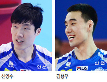 뒷심 부족에 허덕이던 대한항공이 이번 시즌 달라졌다. 전체 정규리그 일정 가운데 3분의 2가량을 소화한 11일 현재 2위에 올라 있다. 박기원 감독이 시즌 내내 체력의 중요성을 강조했던 효과뿐 아니라 35세 동갑내기 베테랑 콤비가 든든하게 팀을 지키고 있기 때문이다. 신영수, 김형우가 바로 그들이다. 팀의 두꺼운 선수층 때문에 줄곧 웜업존(선수 대기 구역)을 지켜야 했던 두 선수가 최근 출전 기회를 늘려가며 팀 운영에 숨통을 틔우고 있다. 경기 도중 주전 선수들이 체력에 부담을 느끼는 상황에서 코트에 나서 구원투수 역할을 톡톡히 하고 있다. V리그 출범 첫해(2005년) 신인 드래프트 1, 2순위로 나란히 지명을 받은 두 선수는 줄곧 대한항공 유니폼만을 입고 있다.