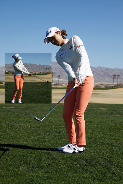 두 번째는 로프트의 움직임이다. 셋업할 때 설정해 둔 페이스의 로프트를 기억해 둬야 한다. 스윙하는 동안 손과 손목을 지나치게 많이 사용하면 로프트가 변하게 된다. 대부분은 처음 설정된 각도보다 커지거나 작아지는 현상이 나온다. 로프트가 변하는 공의 탄도에 영향을 준다. 로프트가 작아진 상태로 공을 맞히면 탄도가 낮아져 그린에 떨어진 뒤 많이 굴러가게 되고, 반대로 로프트가 커진 상태에서 임팩트가 되면 탄도가 높아져 생각보다 멀리 날아가지 않을 수 있다. 셋업에서 설정된 로프트의 각도가 임팩트 이후까지 그대로 유지될 수 있도록 해야 한다.