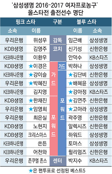 ‘삼성생명 2016∼2017 여자프로농구 올스타전’이 15일 용인체육관에서 열린다. 핑크스타(우리은행·KDB생명·KEB하나은행), 블루스타(삼성생명·신한은행·KB스타즈)의 대결로 진행될 이번 올스타전은 팀당 12명(총 24명)의 선수들이 팬들 앞에서 자신의 기량을 마음껏 펼치는 경연장이 될 전망이다.