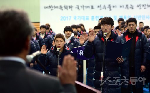 펜싱 박상영(앞줄 오른쪽)과 유도 정보경(앞줄 왼쪽)이 18일 태릉선수촌에서 열린 ‘2017년 국가대표 훈련 개시식 및 체육인 신년하례회’에서 이기흥 대한체육회장(뒷모습)이 지켜보는 가운데 선수대표 선서를 하고 있다. 태릉선수촌 | 김민성 기자 marineboy@donga.com