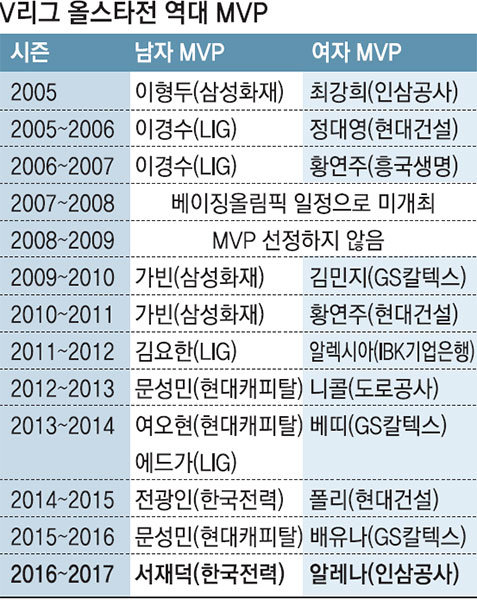 여자부 1~2세트, 남자부 3~4세트 15점제로 치러진 올스타전에서 ‘K-스타’ 팀이 4세트 전부를 이겼다. 그러나 올스타전은 승패가 아니라 어떻게 과정을 즐겼느냐가 중요하다. 서재덕과 전광인은 이런 능력까지도 탁월했다. 서재덕은 8점을 올리는 동안, 전광인과 콤비를 이룬 젖병 세리머니 등, 강렬한 임팩트를 남겼다. 팬이 뽑은 얼짱 콘테스트에서도 문성민(현대캐피탈)을 누르고 1위에 오르는 이변(?)을 연출한 전광인은 세리머니상을 받았다. 우리카드 리베로 정민수와 공동 수상이었다. 정민수는 ‘될 때까지 백어택 공격’으로 노력 점수를 받았다. 모든 선수들이 다치지 않고, 웃으며 마무리된 축제의 주인공은 서재덕-전광인 콤비였다. 서재덕은 수상 직후 “이제 전광인이 하나도 안 부럽다. 요즘 딸 키우는 재미에 빠져있는데 팬들도 보기 좋았던 것 같아 다행”이라고 웃었다. 여자부 MVP는 ‘미스 오레곤’ 알레나(인삼공사)가 뽑혔다. ‘V-스타’ 팀이 패했음에도 알레나의 밝은 에너지가 득표력을 끌어올렸다.