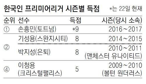 이로써 이번 시즌 9호 골을 기록한 손흥민은 기성용(스완지시티)과 박지성(은퇴)이 갖고 있던 한국인 프리미어리거 한 시즌 최다 골(8골) 기록을 갈아 치웠다. 리그 7호 골을 기록한 손흥민은 또 기성용이 보유한 한 시즌 리그 최다 골(8골) 기록에도 한 골 차로 다가섰다. 기성용은 2014∼2015시즌에 리그에서만 8골을 넣었고, 박지성은 맨체스터 유나이티드에서 뛰던 2010∼2011시즌에 리그에서 5골, 리그컵 대회 2골, 유럽축구연맹(UEFA) 챔피언스리그에서 1골을 기록했다. 손흥민은 이번 시즌 축구협회(FA)컵과 UEFA 챔피언스리그에서 한 골씩을 넣었다. 손흥민은 29일 4부 리그 팀인 위컴비와의 FA컵 32강전에서 한국인 프리미어리거 최초의 한 시즌 두 자릿수 득점에 도전한다.