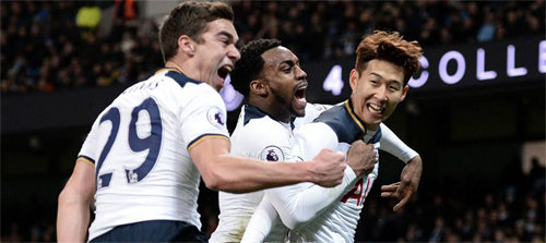 잉글랜드 프리미어리그(EPL) 토트넘에서 뛰는 손흥민(오른쪽)이 22일 영국 맨체스터 에티하드 스타디움에서 열린 맨체스터시티와의 방문경기에서 후반 32분 득점에 성공한 뒤 동료들과 함께 기뻐하고 있다. 사진 출처 토트넘 홈페이지