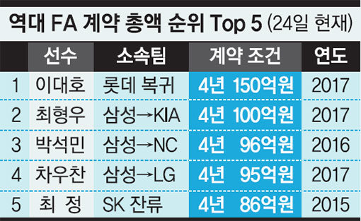 이대호 계약은 총액 외에 세부 내역은 발표하지 않는 형태로 합의가 됐다. KBO 가이드북에 공시가 될 것이기에 이대호의 연봉과 계약금은 공개될 것이다. 액수를 초월한 파격은 계약에 옵션이 없다는 점이다. 계약기간과 금액이 전부 보장이다. 롯데로서는 상당한 리스크를 감수한 것이다. 이에 대해 이 단장은 “이대호의 철저한 몸 관리를 믿었다. 이승엽(41·삼성), 이호준(41·NC) 사례에 비춰볼 때, 이대호도 (4년간) 해줄 수 있을 것이라 봤다”고 답했다. 이 단장은 “황재균(30)이 롯데에 남았더라도 (이대호 협상은) 똑같이 움직였을 것”이라고 말했다. 발표액 기준, 종전 KBO 최대규모 계약은 KIA 최형우(34)의 100억원 계약이었다. 심리적 마지노선인 100억의 벽이 깨진 충격파가 채 가셔지기도 전에 150억 계약이 탄생했다. 롯데가 KBO 생태계를 흔들었다는 세간의 지적에 이 단장은 “한국 미국 일본 야구에서 검증된 이대호라면 최고대우는 당연했다”고 짧게 말했다.