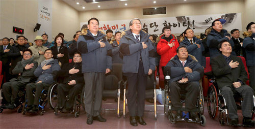 25일 경기 이천시 대한장애인체육회 이천훈련원에서 열린 2017년 국가대표 훈련개시식에서 참석자들이 국민의례를 하고 있다.
