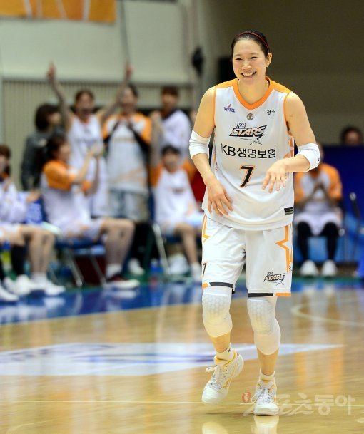 13일 구리시체육관에서 열린 ‘삼성생명 2016-2017 여자프로농구’ KB스타즈와 KDB생명 경기에서 3쿼터 KB스타즈 강아정이 500 3점슛을 성공시킨 후 밝게 웃고 있다. 구리 | 김종원 기자 won@donga.com