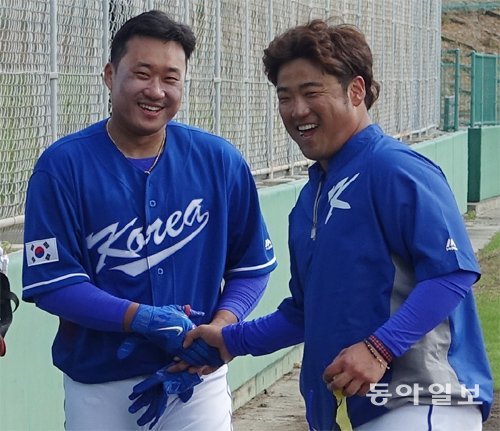 13일 일본 오키나와에서 진행된 월드베이스볼클래식(WBC) 대표팀 전지훈련 첫날. 오전 수비 훈련 도중 내야에서는 수시로 웃음이 터져 나왔다. 3루수 박석민, 포수 김태군 때문이었다. 포수 김태군이 어려운 땅볼을 처리하자 박석민이 “역시 NC의 얼굴답다”며 운을 뗐고, 박석민의 호수비에 김태군이 “역시 NC의 주장”이라며 화답했다. 두 선수는 능청스러운 표정으로 공을 받을 때마다 큰 소리로 칭찬을 주거니 받거니 했다. “생각보다 수비를 잘한다”는 김광수 코치의 말에 박석민이 훈련 도중 고개를 숙여 인사를 하자 내야에서는 다시 한 번 웃음이 터져 나왔다.