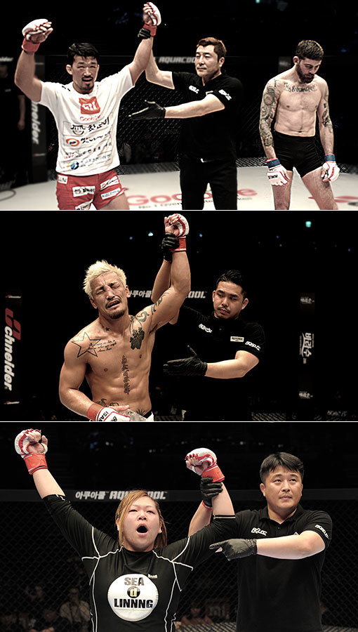 서울 장충체육관에서 열린 ROAD FC 036에서 열린 100만 달러 토너먼트 인터내셔널 예선에서 2년의 공백을 극복한 한국의 김창현(위)과 극적인 재기에 성공한 일본의 사사키 신지(가운데). 둘은 이번 승리로 모두 16강 본선에 진출했다. 함께 열린 여자 무제한급에서 터프한 이미지로 강한 인상을 남기며 승리한 일본의 요시코(아래). 사진제공 | ROAD FC