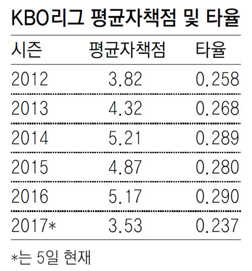 하지만 지난달 31일 막을 올린 2017 프로야구는 최근 대세로 떠오른 ‘타고투저’와는 다른 양상이 전개되고 있다. 올 시즌(5일 기준) 리그 전체 타율은 0.237에 평균자책점은 3.53으로 지난해 수치(타율 0.290, 평균자책점 5.17)에 비해 한참 밑돈다. 아직 시즌 초반이긴 하지만 최근 5시즌과 비교해 봐도 가장 낮다.