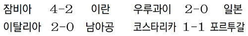 한편 잠비아와 우루과이가 16강에 합류했다. 잠비아는 24일 C조 경기에서 이란에 0-2로 뒤지다 후반 9분부터 17분간 4골을 몰아쳐 4-2 역전승을 거두고 2연승으로 16강 진출을 확정했다. 우루과이는 D조에서 일본을 2-0으로 완파하고 역시 2연승으로 16강 티켓을 거머쥐었다.