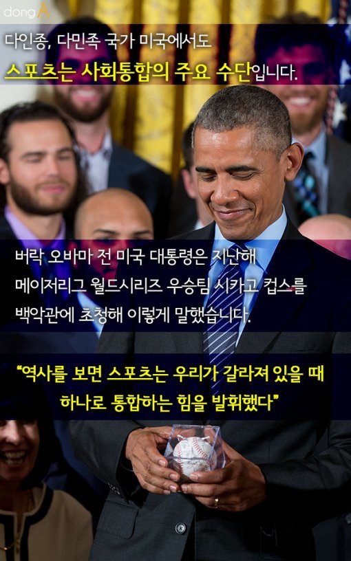 #6 다인종, 다민족 국가 미국에서도 스포츠는 사회통합의 주요 수단입니다. 스포츠 마니아인 버락 오바마 전 미국 대통령은 지난해 메이저리그 월드시리즈 우승팀 시카고 컵스를 백악관에 초청해 이렇게 말했습니다. “역사를 보면 스포츠는 우리가 갈라져 있을 때 하나로 통합하는 힘을 발휘했다.”