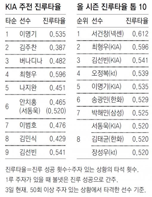 KBO리그 공식기록업체인 스포츠투아이에 진루 관련 기록을 의뢰한 결과, KIA 주전 타자들의 ‘진루타율(진루 성공률)’이 다른 팀 주전 타자들에 비해 높은 것으로 나타났다. 진루타율은 타석에 있는 타자가 누상의 주자가 진루할 수 있게 안타, 볼넷, 번트, 희생타 등으로 도운 비율이다. 그만큼 KIA 타자들이 주자가 있을 때는 욕심을 부리지 않고 정확한 타격으로 팀 득점 가능성을 높였다는 것이다.