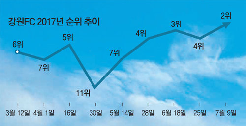 도민구단 강원 FC가 K리그 클래식 승격 팀의 역사를 새로 쓰고 있다. 강원은 9일 안방인 평창 알펜시아 스키점핑타워 축구장에서 열린 19라운드 경기에서 상주를 2-0으로 완파하며 2위(승점 32·9승 5무 5패)로 뛰어올랐다. 울산과 승점이 같지만 득점에서 32-18로 크게 앞섰다. 1위 전북(11승 5무 3패)과는 승점 6점 차다. 전반기를 마친 상황에서 승격 팀이 2위를 한 것은 처음 있는 일이다. 역대 승격 팀 최고 순위는 지난해 상무가 기록한 6위(승점 43·12승 7무 19패)다. 강원은 현재 17경기 연속 득점을 이어가고 있다. 구단 최초이자 승격 팀 최다 기록이다. 6월 18일 제주를 꺾고 달성한 5연승도 마찬가지다. 이전 기록은 지난해 상주의 6경기 연속 득점과 상주·광주의 3연승이었다.
