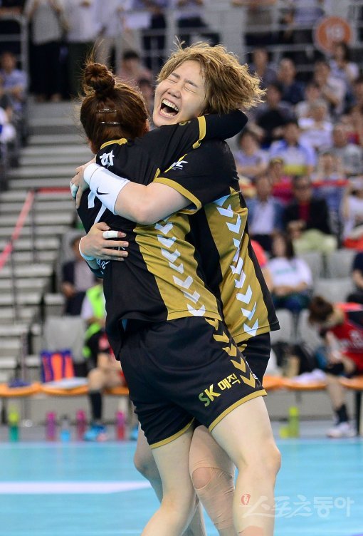 SK슈가글라이더즈 선수들이 2017 SK핸드볼 코리아리그 여자부 챔피언결정전에서 서울시청을 31-30으로 꺾은 뒤 우승 세리머니를 펼치고 있다. 올림픽공원 | 김종원 기자 won@donga.com 프리에이전트(FA) 최대어로 SK 슈가글라이더즈로 이적 2시즌 만에 우승을 선사했다. “오늘 초반부터 집중 견제가 있어서 어시스트를 많이 생각했다. (유)소정이, (최)수지가 잘 해줘서 상대 수비가 벌어졌다. 그 틈을 노린 것이 마지막에 잘 됐다”고 공을 돌렸다.